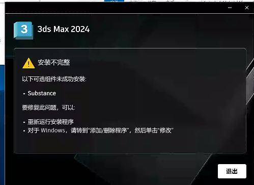 当3dmax高版本出现安装错误代码2146885616,或者可选组件未成功安装:-Substance时,如图