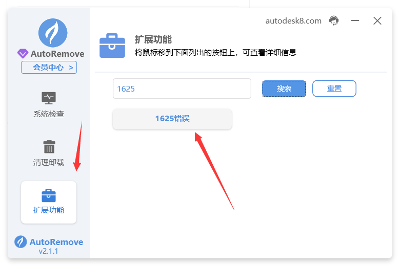 打开autoremove,点击扩展功能,搜索1625,点击1625按钮进行修复,再重新安装