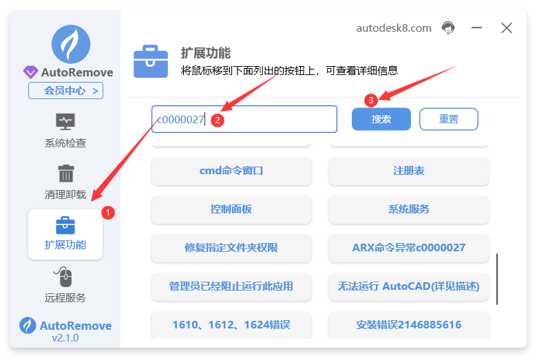 点击autoremove扩展功能,输入c0000027点击搜索,然后双击出现的这个按钮既可。