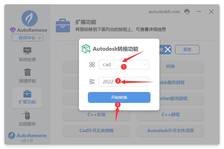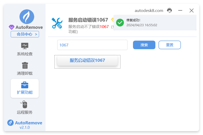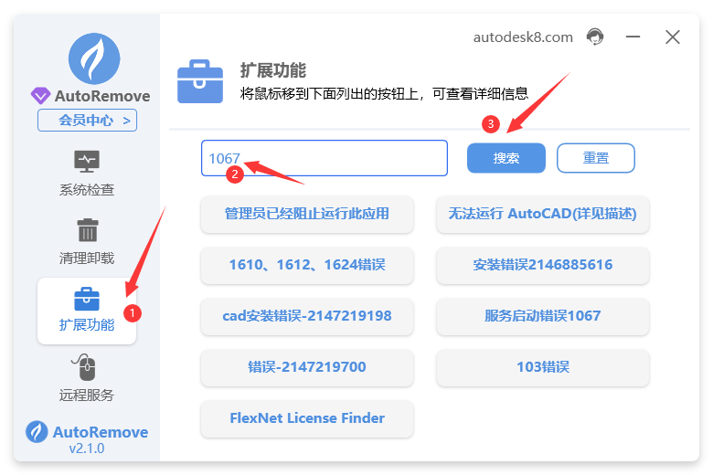 1. 打开autoremove点击扩展功能,输入1067点击搜索