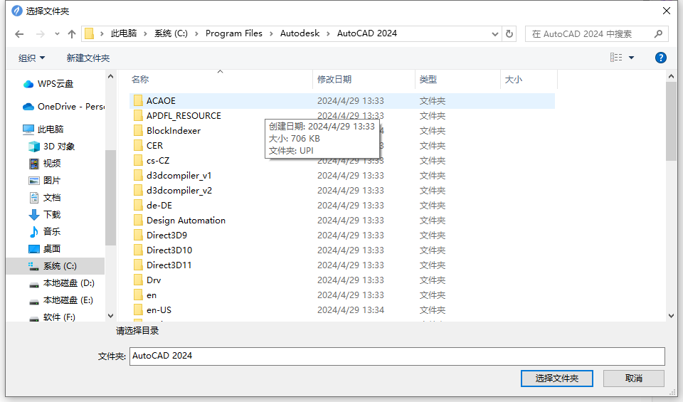 8.选择到你的安装目录,类似图里这种结构,点击选择文件夹。然后再重新点击扩展 cad致命错误操作时 按照前面教程操作。
