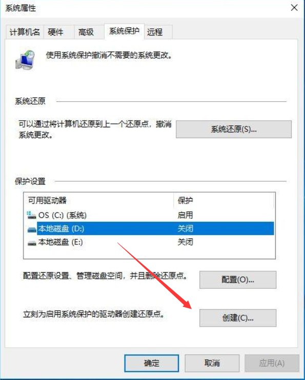 在“系统属性”的“系统保护”选项卡上,选择“创建”。