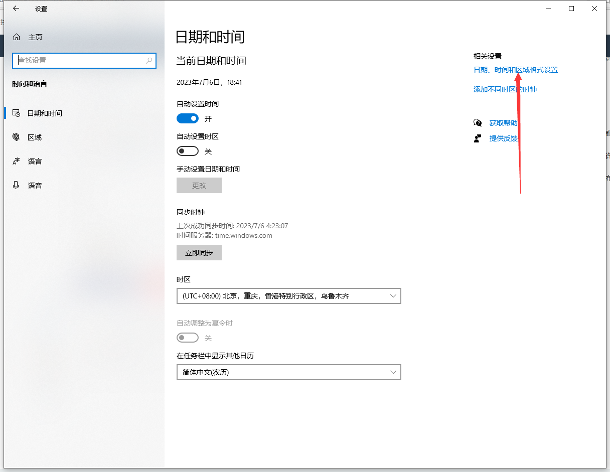 在"日期时间和区域格式设置"中,点击"区域"选项。